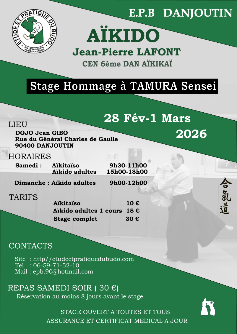 « Tous les Évènements STAGE AIKIDO à DANJOUTIN 1 mars de9 h 00 min - 12 h 00 min « STAGE AIKIDO à DANJOUTIN Ajouter au calendrier Google Agenda iCalendar Outlook 365 Outlook Live Détails Date : 1 mars Heure : 9 h 00 min - 12 h 00 min Catégorie d’Évènement: Stages Aïkido Organisateur Francis WACHENHEIM Téléphone 06 59 71 52 10 E-mail epb.90@hotmail.com Lieu DOJO Jean GIBO Avenue du Gal DE GAULLE DANJOUTIN, 90400 France + Google Map