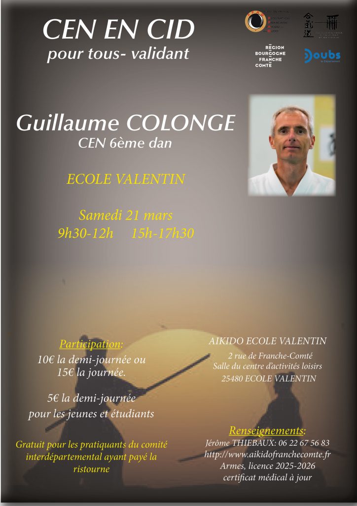 « Tous les Évènements STAGE AIKIDO CEN EN CID A ECOLE-VALENTIN 21 mars de9 h 30 min - 17 h 30 min 15€ « STAGE HOMMAGE A TAMURA SENSEI Ajouter au calendrier Google Agenda iCalendar Outlook 365 Outlook Live Détails Date : 21 mars Heure : 9 h 30 min - 17 h 30 min Prix : 15€ Catégorie d’Évènement: Stages Aïkido Organisateur Jérôme THIEBAUX Téléphone 06 22 67 56 83 Lieu ECOLE-VALENTIN 2 rue de Franche-Comté ECOLE-VALENTIN, 25480 + Google Map